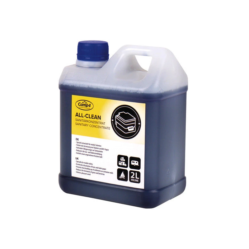 Bidon de 2 litres de la marque CAMP4, l’All-Clean permet de traiter aussi bien la cuvette, que le réservoir d’eau ou à matières de vos toilettes chimiques à bord du camping-car ou du fourgon.