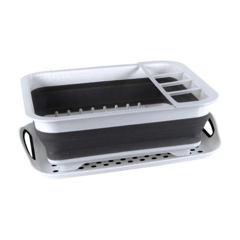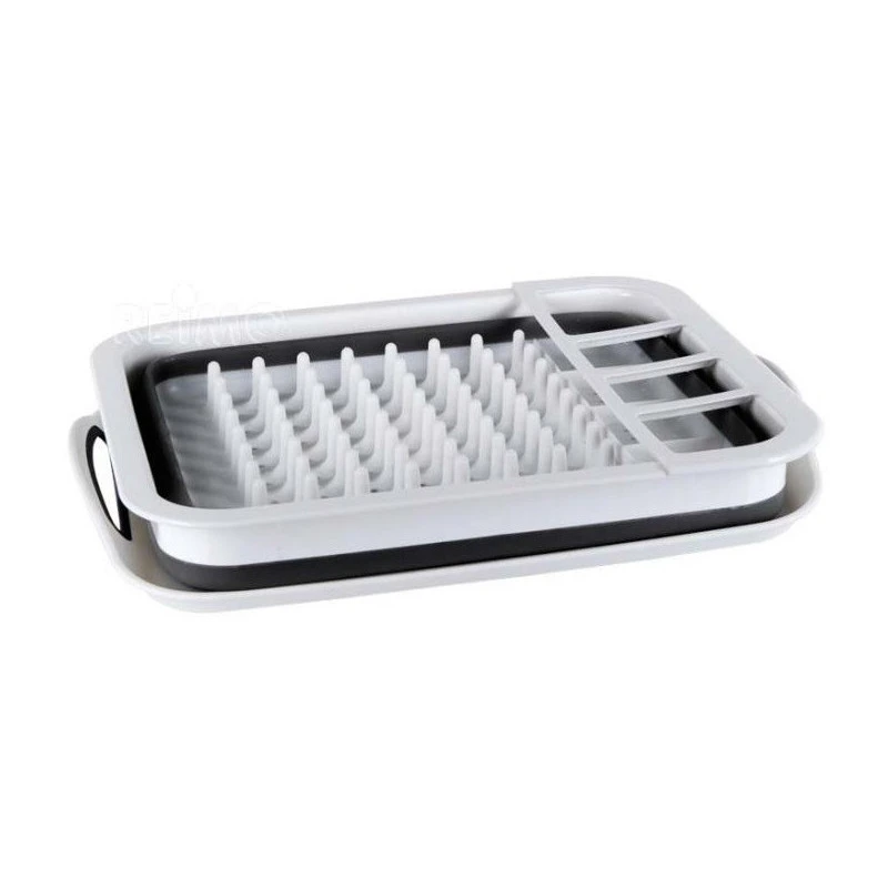 Egouttoir Ă vaisselle en silicone pliant pour l’Ă©quipement des bateaux ou camping-cars, livrĂ© avec plateau rĂ©cupĂ©rateur d’eau Ă poignĂ©e.